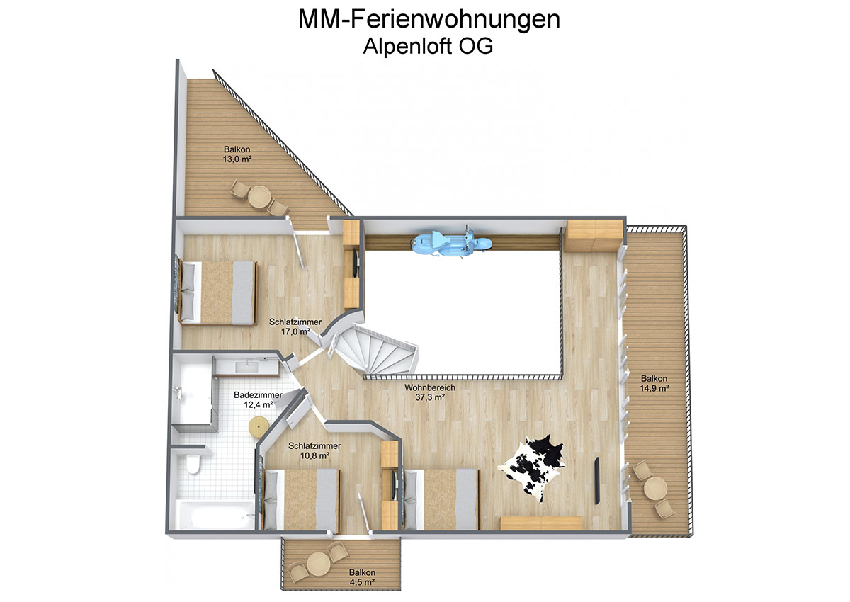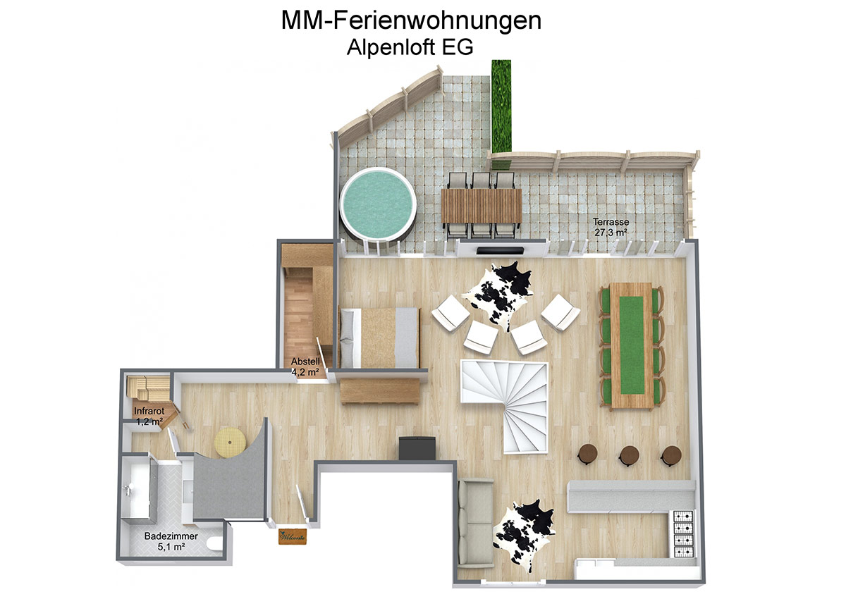 Das Chalet Alpenloft in Mittenwald ist im einzigartigen alpenländischen Style eingerichtet und bietet auf zwei Etagen Schlafmöglichkeiten für insgesamt 8 Gäste. Das offen gestaltete Alpenloft ist mit vielen Highlights ausgestattet.