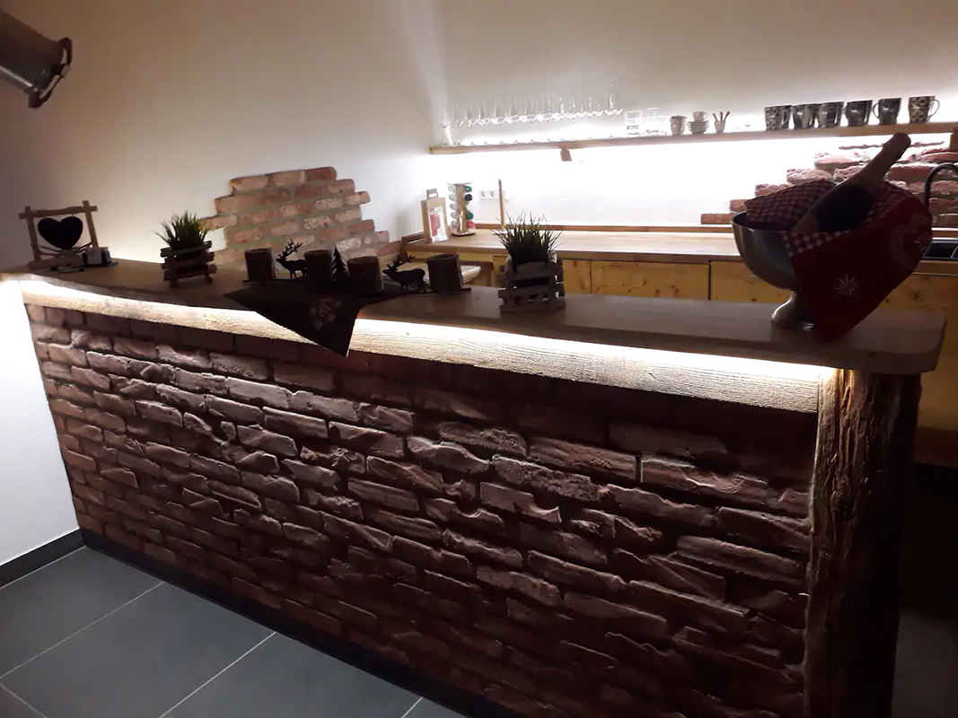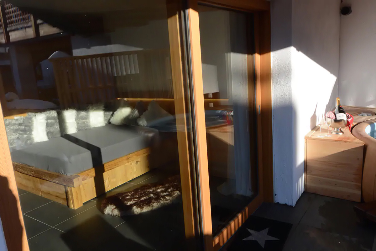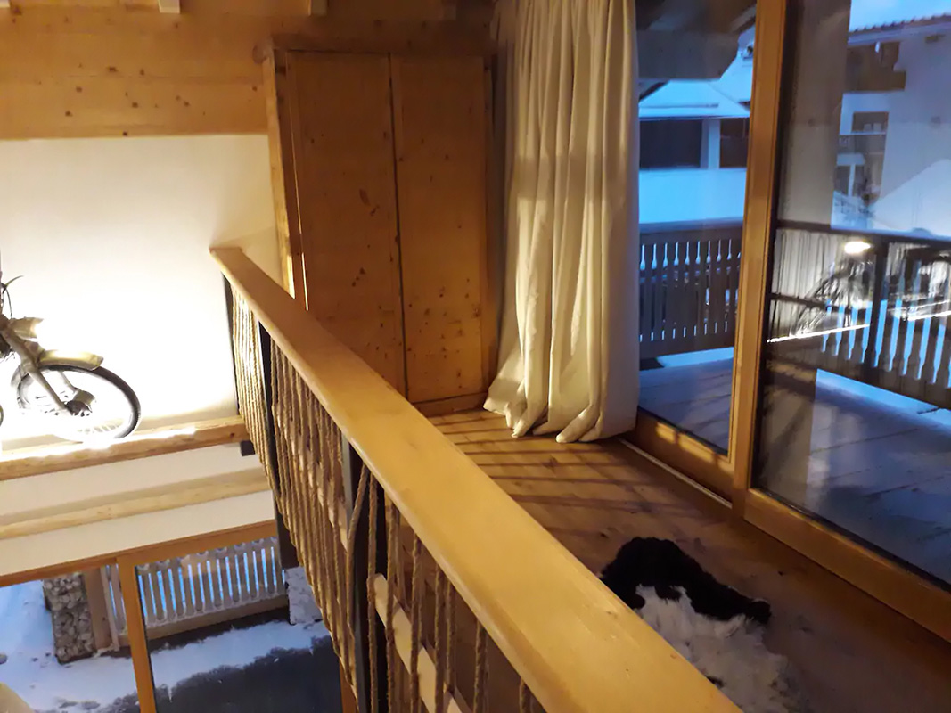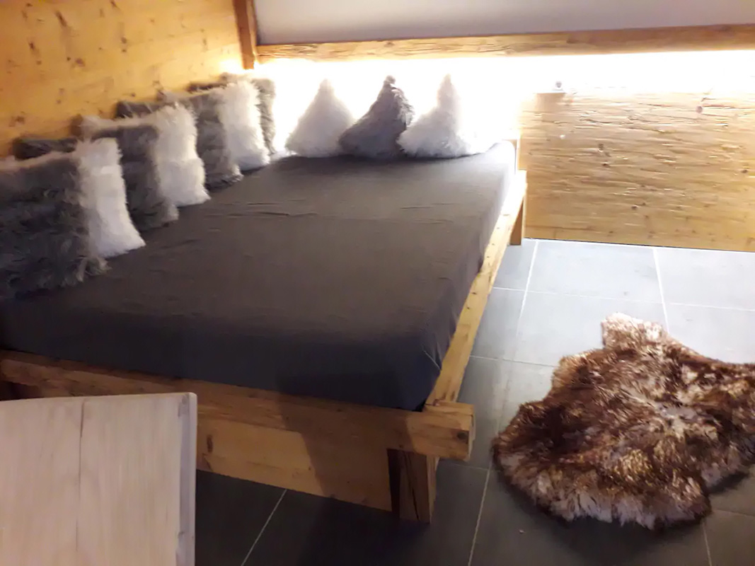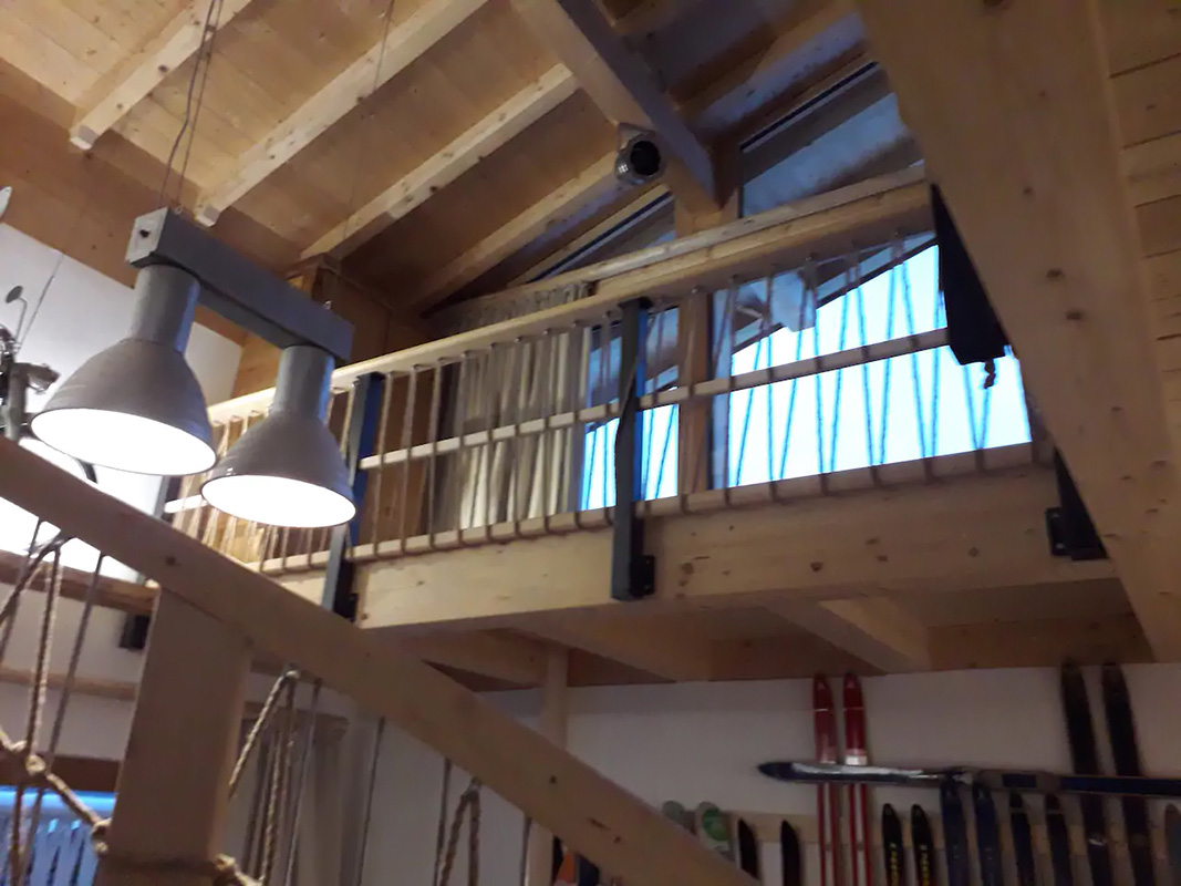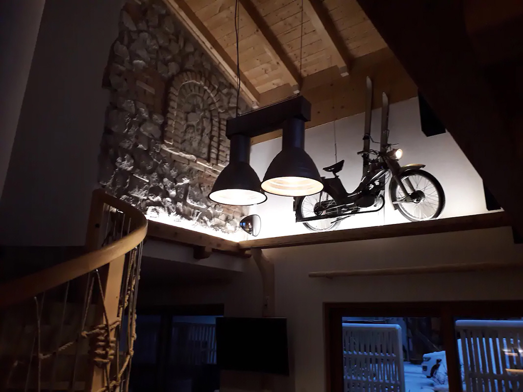 Im Erdgeschoss befindet sich eine offene Küche mit einer Bar. Am großen Esstisch können 8 Personen sitzen. Im Wohnbereich im Erdgeschoss befindet sich ein zusätzliches Kingsizebett, welches bei Bedarf als große Liegefläche zum Fernsehen genutzt werden kann. Der große Fernseher ist nach allen Seiten drehbar. Insgesamt befinden sich im Chalet 5 Fernseher.