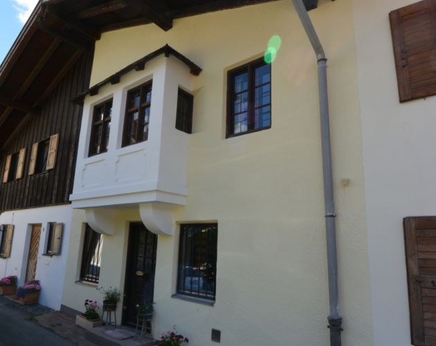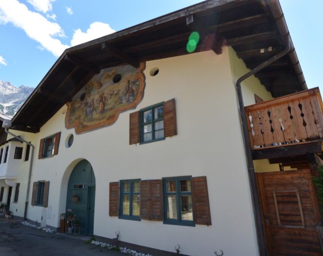 Das Hoglhaus liegt zentral in Mittenwald und bietet im Garten einen Blick auf Kirchturm und Karwendel. Die holzvertäfelte Wohnküche lädt zum geselligen Beisammensein ein.