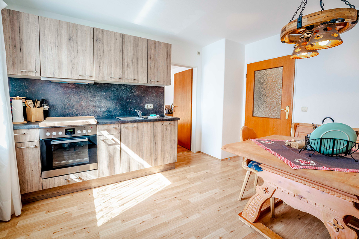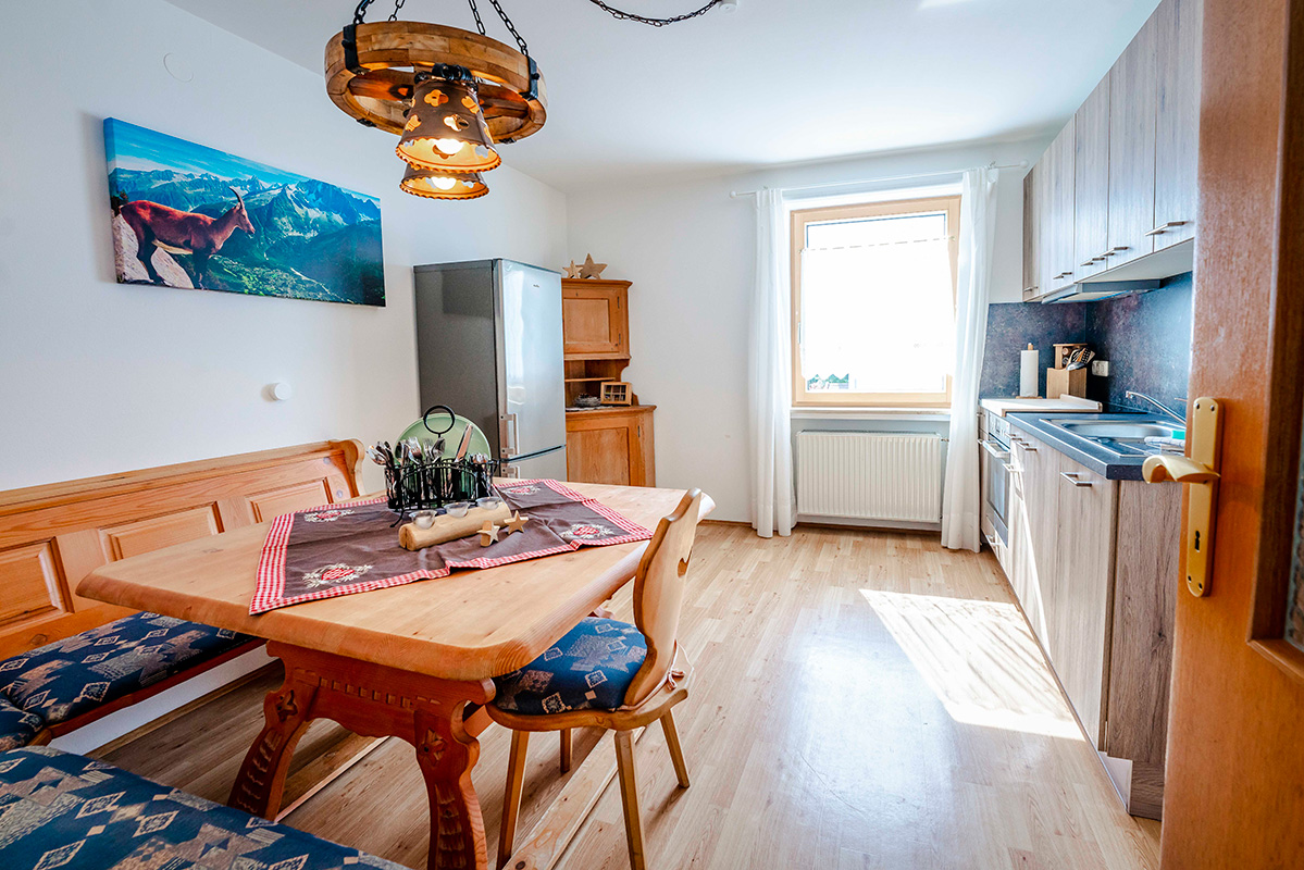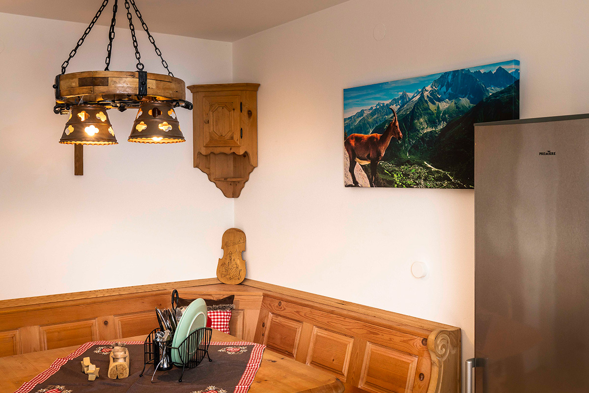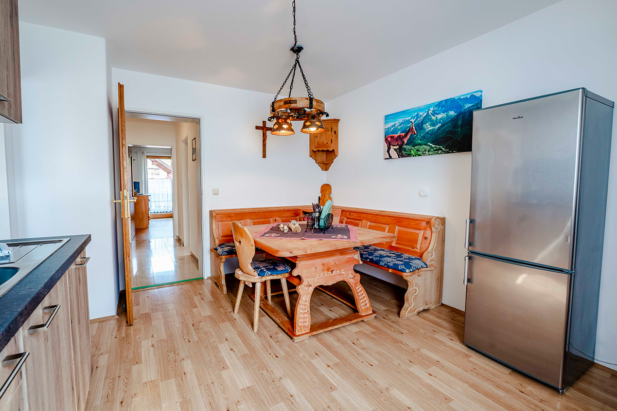Die Küche ist gut ausgestattet und bietet alles für einen gemütlichen Kochabend. In der Küche ist eine rustikale Eckbankgruppe integriert.