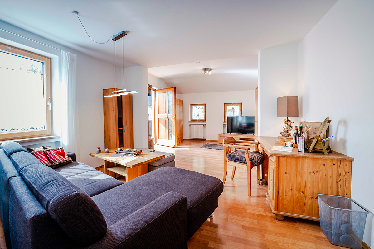 Im großen Wohnzimmer mit Balkonzugang befindet sich ein Schrankbett und ein Schlafsofa für zwei Personen.