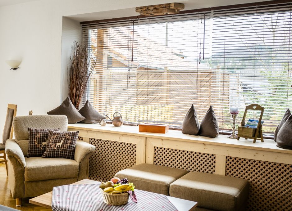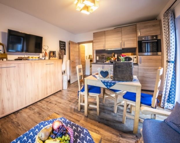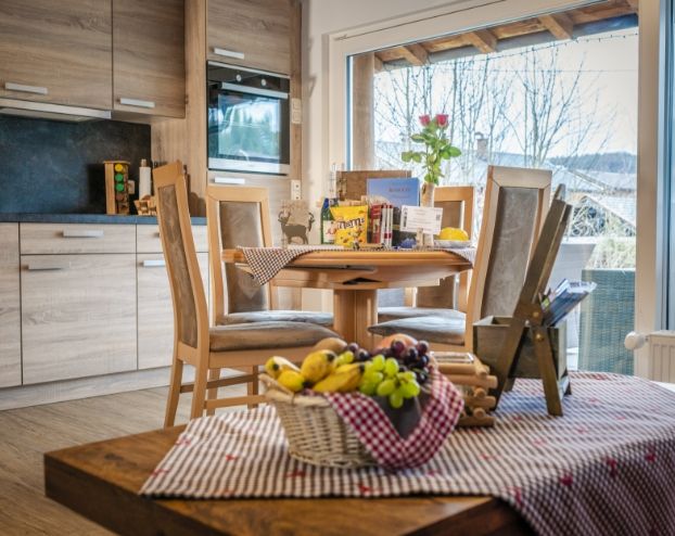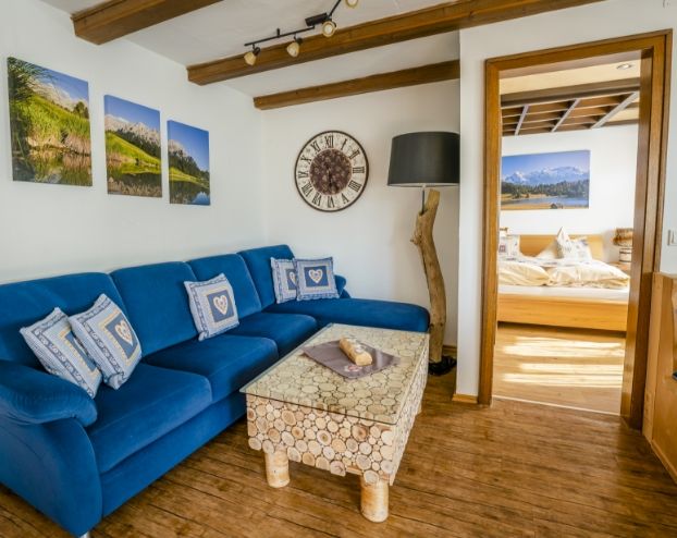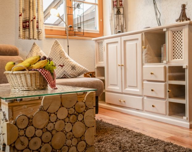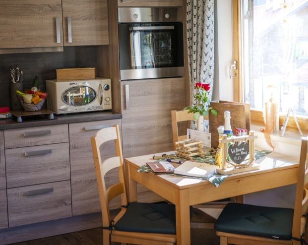 Unsere Ferienwohnung im alpenländischen Stil liegt im Erdgeschoss und ist nach Osten ausgerichtet. Perfekt, für das Frühstück auf der Terrasse mit Blick auf die Berge.