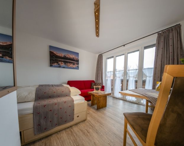 Frisch renovierte Wohnung mit Wohnküche, Sofa und Schrankbett, Westbalkon mit Blick aufs Wettersteinmassiv, Schlafzimmer mit 140 cm Bett und Bad mit Dusche und WC.