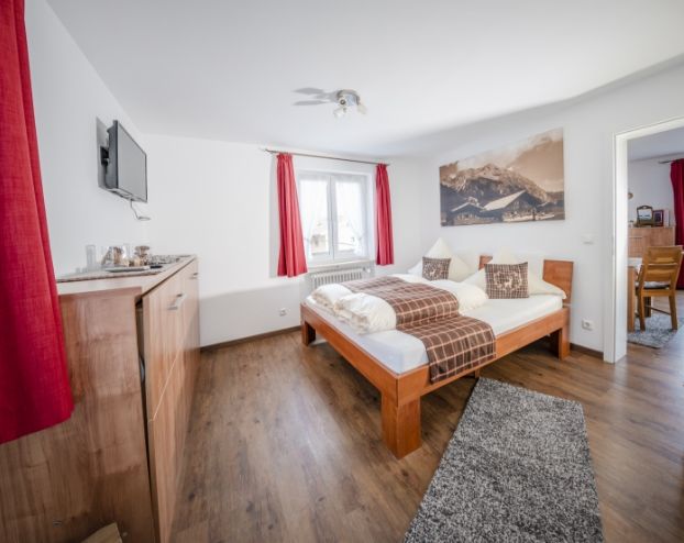 Willkommen in der gemütlichen Ferienwohnung Erli 3 im Obergeschoss – mit Doppelbett, Schlafcouch, kompakter Schrankküche und Bad mit Wanne und Duschmöglichkeit.